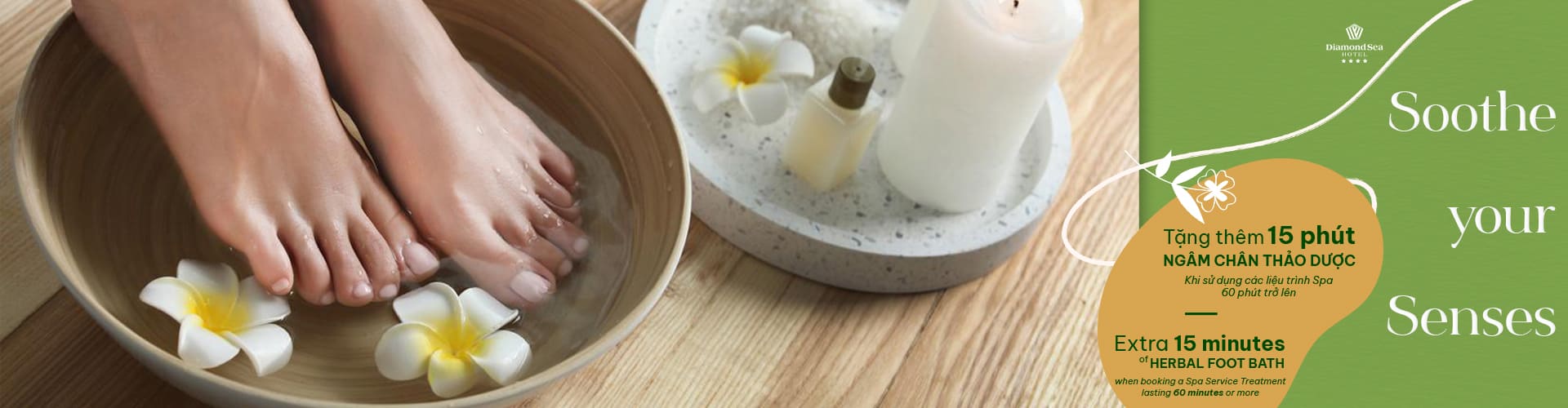 As part of our "Soothe Your Senses" offer, when you book a 60-minute or longer spa service treatment, you'll receive an extra complimentary 15 minutes of herbal foot bath, enhancing your spa experience to a whole new level. Our herbal foot bath uses natural herbs and warm water to soothe tired feet, release tension, and promote relaxation, allowing you to completely relax and unwind.