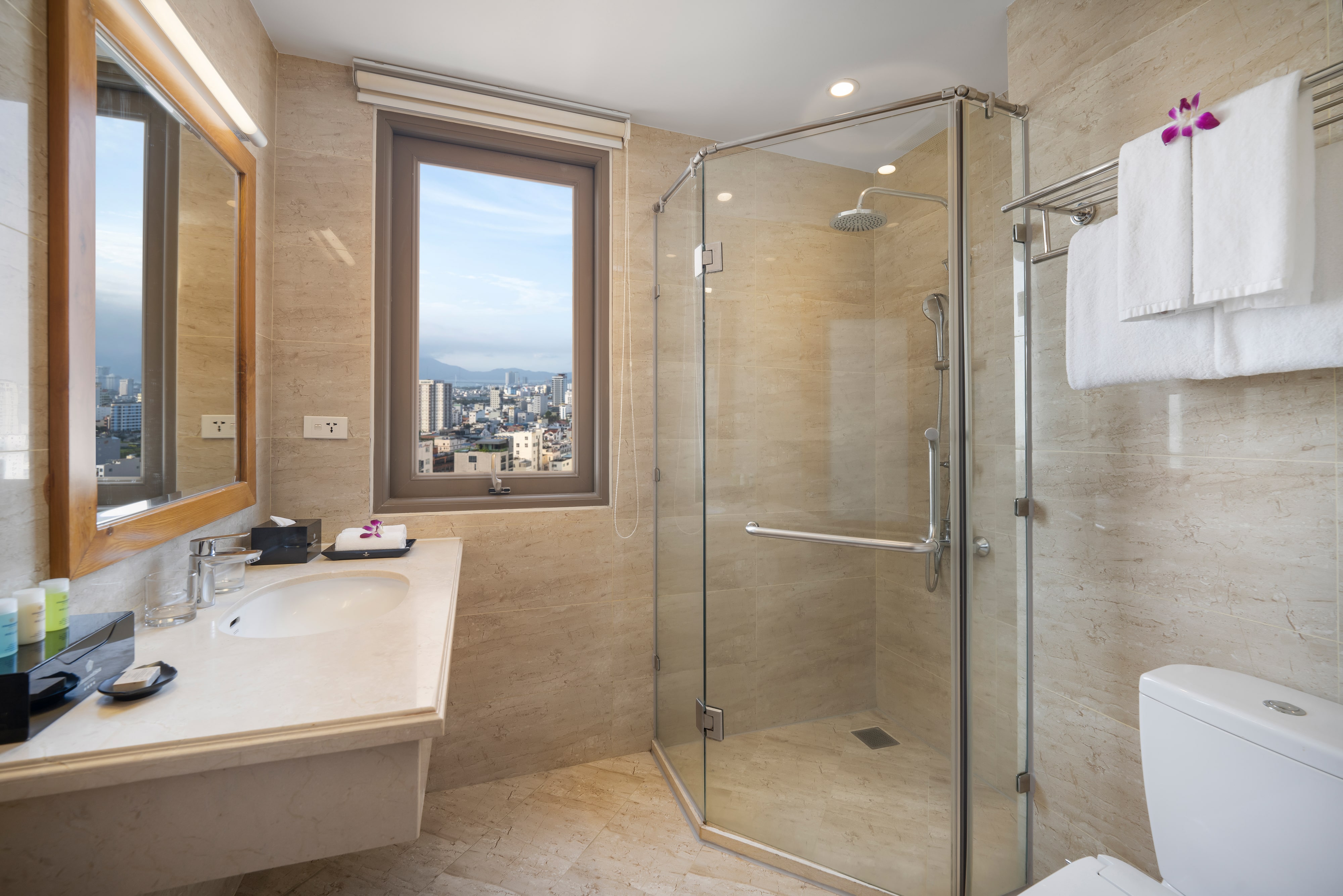 Phòng Junior Double mang đến không gian ấm cúng và đầy đủ tiện nghi, lý tưởng cho các cặp đôi, gia đình hoặc khách đi công tác muốn tìm kiếm sự thoải mái và thuận tiện. Với diện tích khoảng 28m2, phòng được thiết kế nội thất hiện đại và tiện nghi chu đáo mang đến cho bạn một kỳ nghỉ thú vị. Mỗi phòng được trang bị một giường đôi lớn, phủ vải cotton trắng tinh, bên trên là gối lông vũ và chăn lông vũ nhẹ, vòi sen cầm tay, khu vực làm việc tốt, TV màn hình phẳng với các kênh quốc tế…